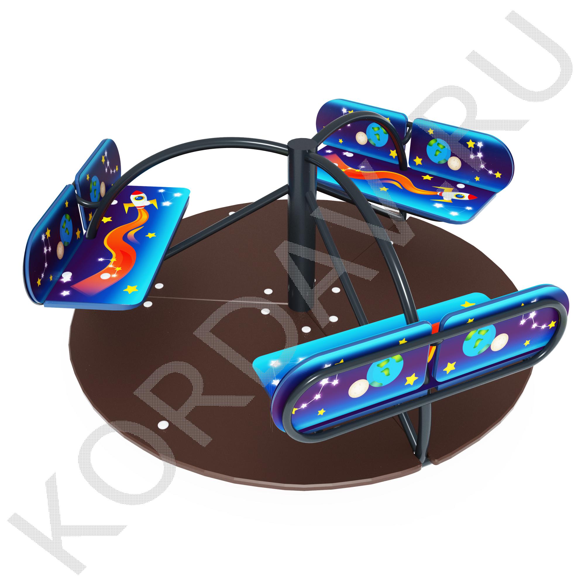 Карусель имеет шесть мест со спинками. В ее основании лежит круглая платформа, которая приводится в движение с помощью рук. Цветовая гамма изделия – это сочетания синего и желтого. Весит такая карусель 96 кг. Отлично подойдет для детей старшего дошкольного возраста. Такую карусель можно установить на любой площадке для детей, используя бетонный фундамент. Она проста в установке и эксплуатации. Отлично развивает физические навыки ребенка, а именно его вестибулярный аппарат, ловкости, мышцы рук и ног.