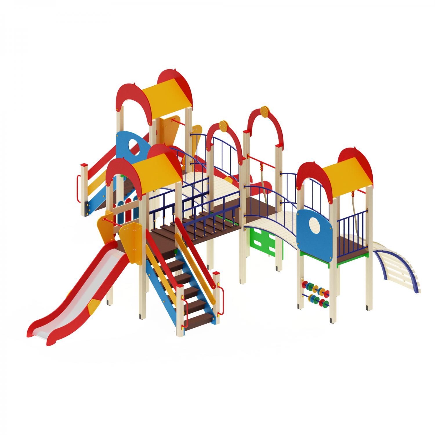 Комплектация игрового комплекса: лестница 2 шт, скат-горка с поручнем и боковыми бортами 2 шт, канат 2 шт, счёты 1 шт, подвесной мост 3 шт, щит скалолаз 1 шт, трап 1 шт.