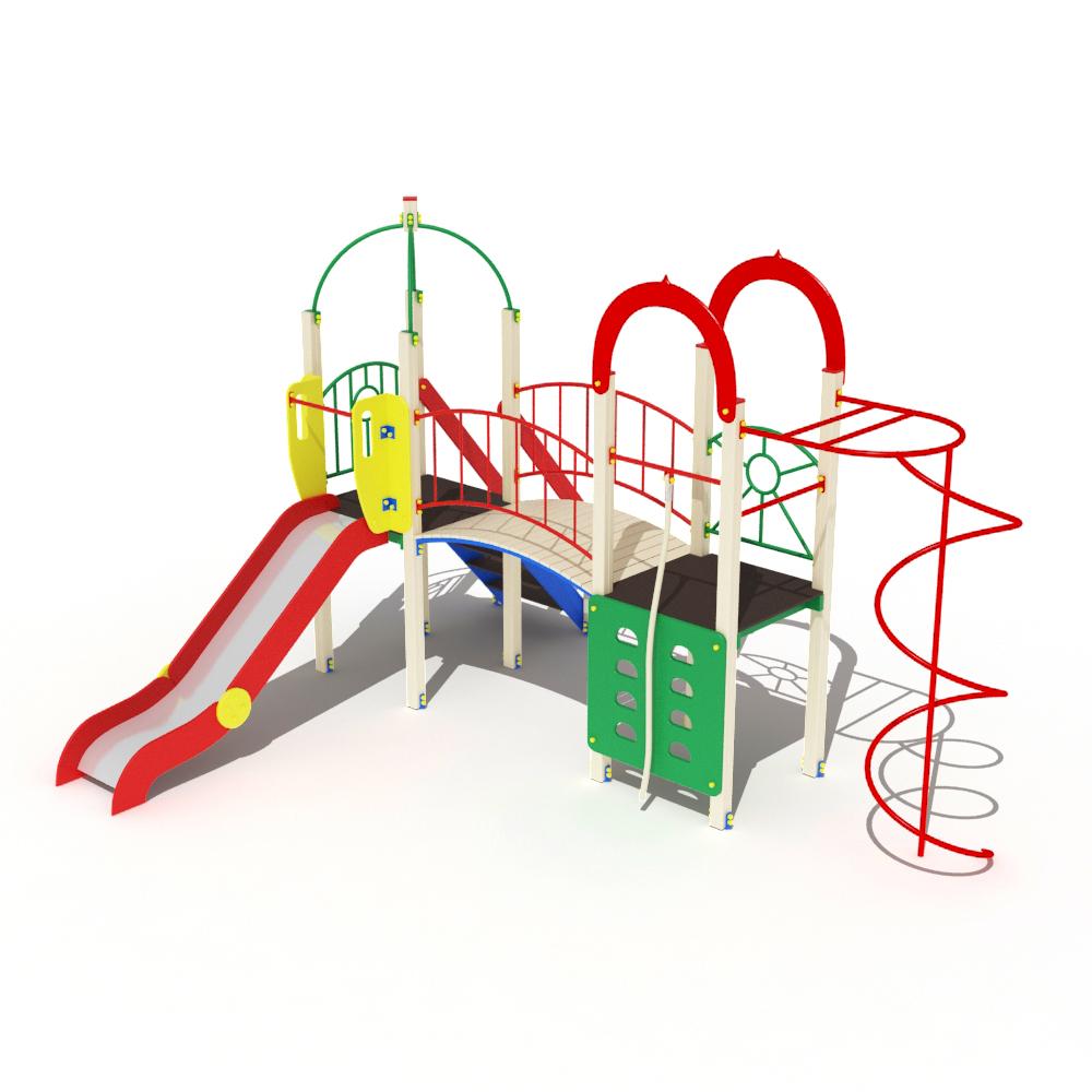 Комплектация игрового комплекса: башни 2 шт, горка 1 шт, щит скалолаз 1 шт, ограждения для лестницы 1 комплект, мост дугообразный 1 шт, ограждения моста 1 комплект, полиуретановый канат 30 мм 1 шт, 1 шест вертикальный со спиралью 1 шт, лестница 1 шт.
