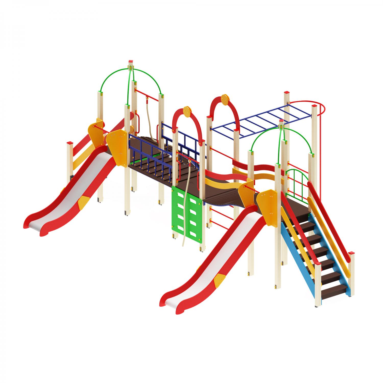 Горка 1500: Скат горки шириной 530 мм, выполнен из нержавеющей стали толщиной 1,5 мм — цельного листа, утопленного в паз бортиков горки. Борта выполнены из влагостойкой фанеры толщиной 24 мм, шириной не менее 150 мм. Опорный каркас горки выполнен из профиля 40×25 и 40×40 мм. Стартовая площадка горки ограждена стальной перекладиной из трубы диаметром 27 мм, установлена на высоте не менее 600 мм от уровня поверхности стартового участка горки и побуждающая ребенка присесть. Размер горки в плане 540x2280x1500. 1 штука.