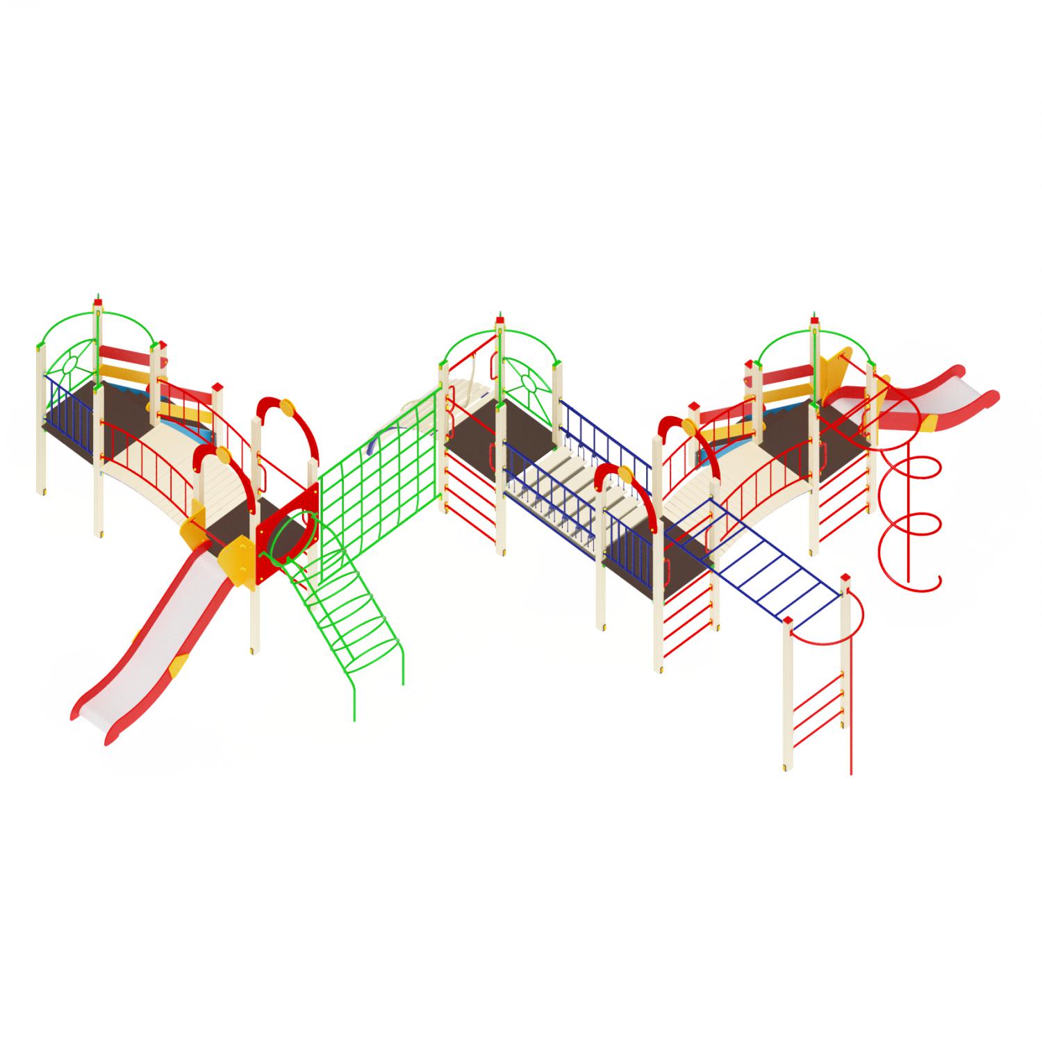 Башни (5 штук) Конструкция включает пять башен, выполненных из четырех клееных брусьев сечением 100×100 мм и высотой 2500 мм. Пол каждой башни изготовлен из ламинированной фанеры с антискользящим покрытием размером 1000×1000 мм и толщиной 18 мм. Три башни украшены декоративными куполами из труб диаметром 27 мм с габаритными размерами 1000×1000×3320 мм. Две башни оснащены декоративными арками из влагостойкой фанеры толщиной 18 мм, состоящими из двух полуарок размером 500×600 мм. Размер башен с арками составляет 1000×1000×3000 мм. Отметка пола всех башен от планировочной отметки площадки равна 1200 мм.