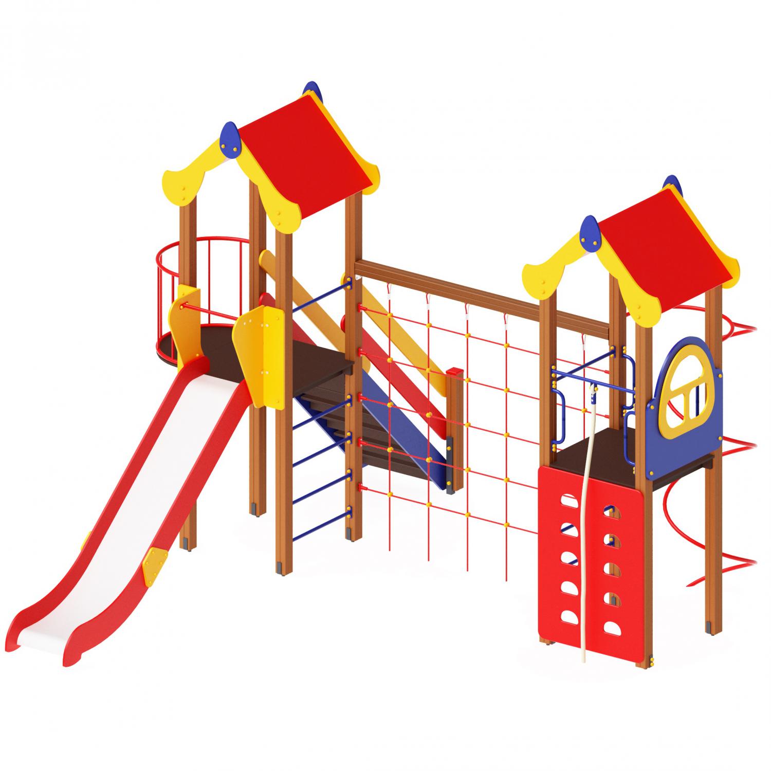 БашниБашни выполнены из четырёх клеёных брусьев 100х100 мм длиной для одной башни 3000 мм. Пол из ламинированной фанеры, с антискользящим покрытием 1000х1000 мм толщиной 18 мм. Сверху выполнена двухскатная крыша из листов фанеры 1000х840 мм, с торцев имеется две арки из влагостойкой фанеры толщиной 18 мм, размером 900х300 мм, стилизованы под серию «Теремок». На одной стороне одной из башен выполнен борт из фанеры «Теремок» размером 1030х980 мм. Отметка пола башни от планировочной отметки площадки 1500 мм. Количество 2 шт.