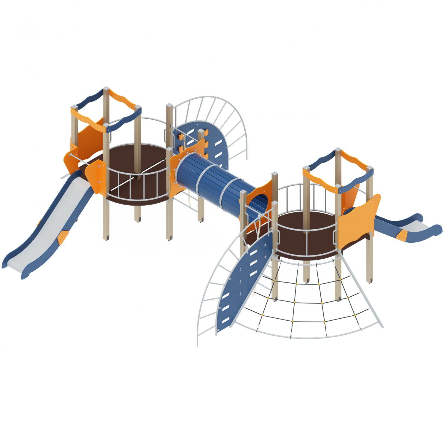 Двойная башня сделана из клееных брусьев размером 100х100 мм, с высотой 2800 мм и 2200 мм. Пол изготовлен из ламинированной фанеры с антискользящим покрытием размерами 1897х950 мм и толщиной 18 мм. Над одной половиной башни расположены декоративные арки из фанеры толщиной 18 мм размерами 990х180 мм. Одна сторона башни закрыта бортом из влагостойкой фанеры толщиной 18 мм размерами 1000х800 мм. Высота пола от уровня планирования — 1200 мм. Комплект: 2 шт.